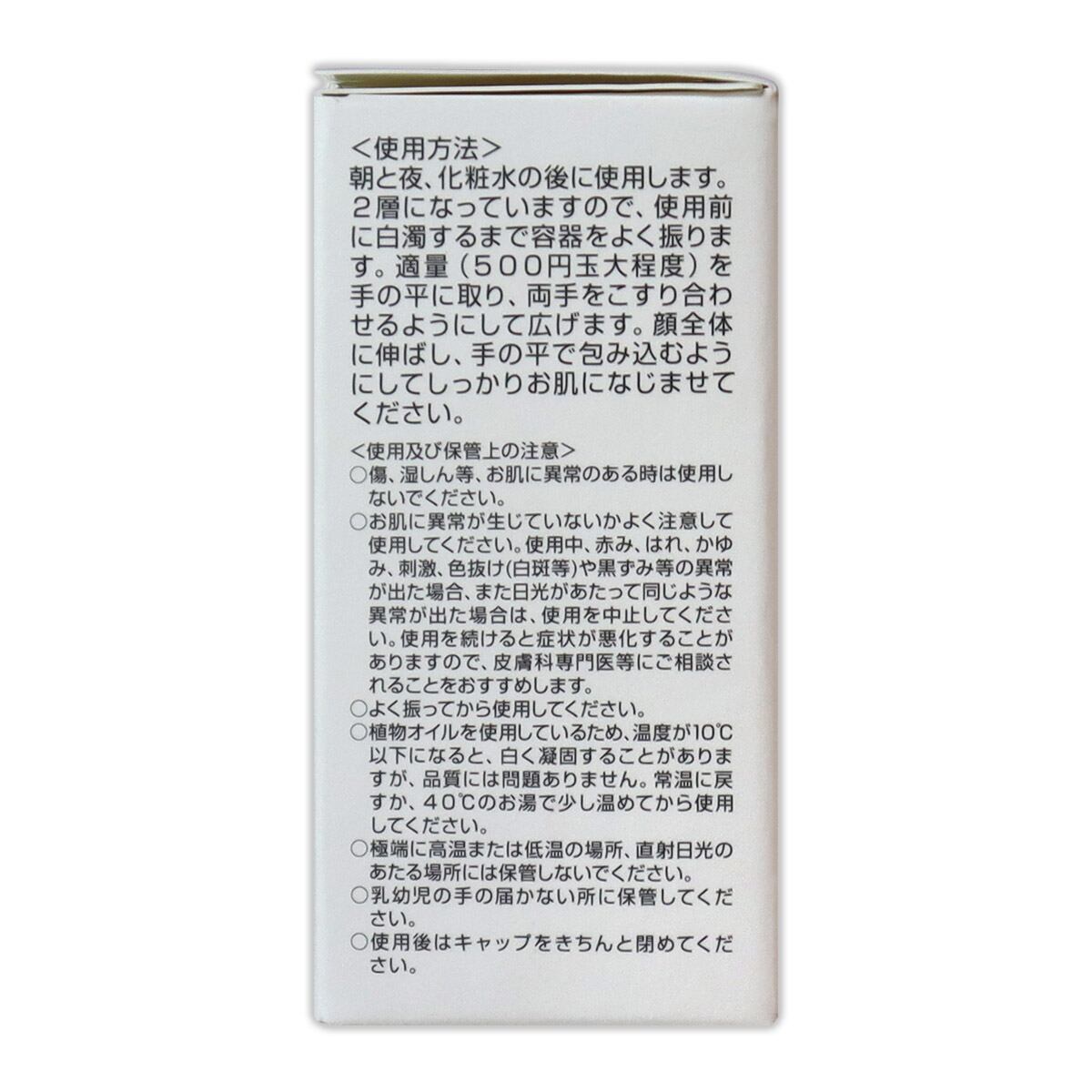 朝と夜、化粧水の後に使用します。2層になっていますので、使用前に白濁するまで容器をよく振ります。適量(500円玉大程度)を手の平に取り、両手をこすり合わせるようにして広げます。顔全体に伸ばし、手の平で包み込むようにしてしっかりお肌になじませてください。