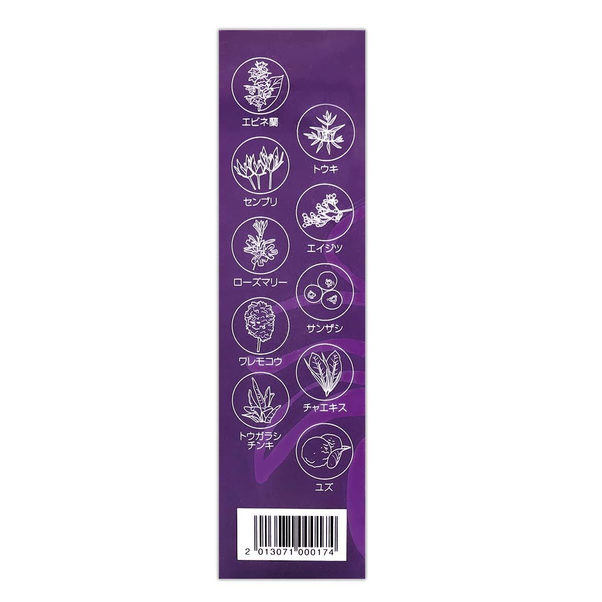 水、エタノール、エビネ抽出エキス、1.3-ブチレングリコール、エイジツエキス、ローズマリーエキス、サンザシエキス、ワレモコウエキス、チャエキス(1)、トリメチルグリシン、トウキエキス(1)、フェノキシエタノール、センブリエキス、トウガラシチンキ、パントテン酸カルシウム、ニコチン酸アミド、塩酸ピリドキシン、ユズエキス、ビオチン、l-メントール、クエン酸