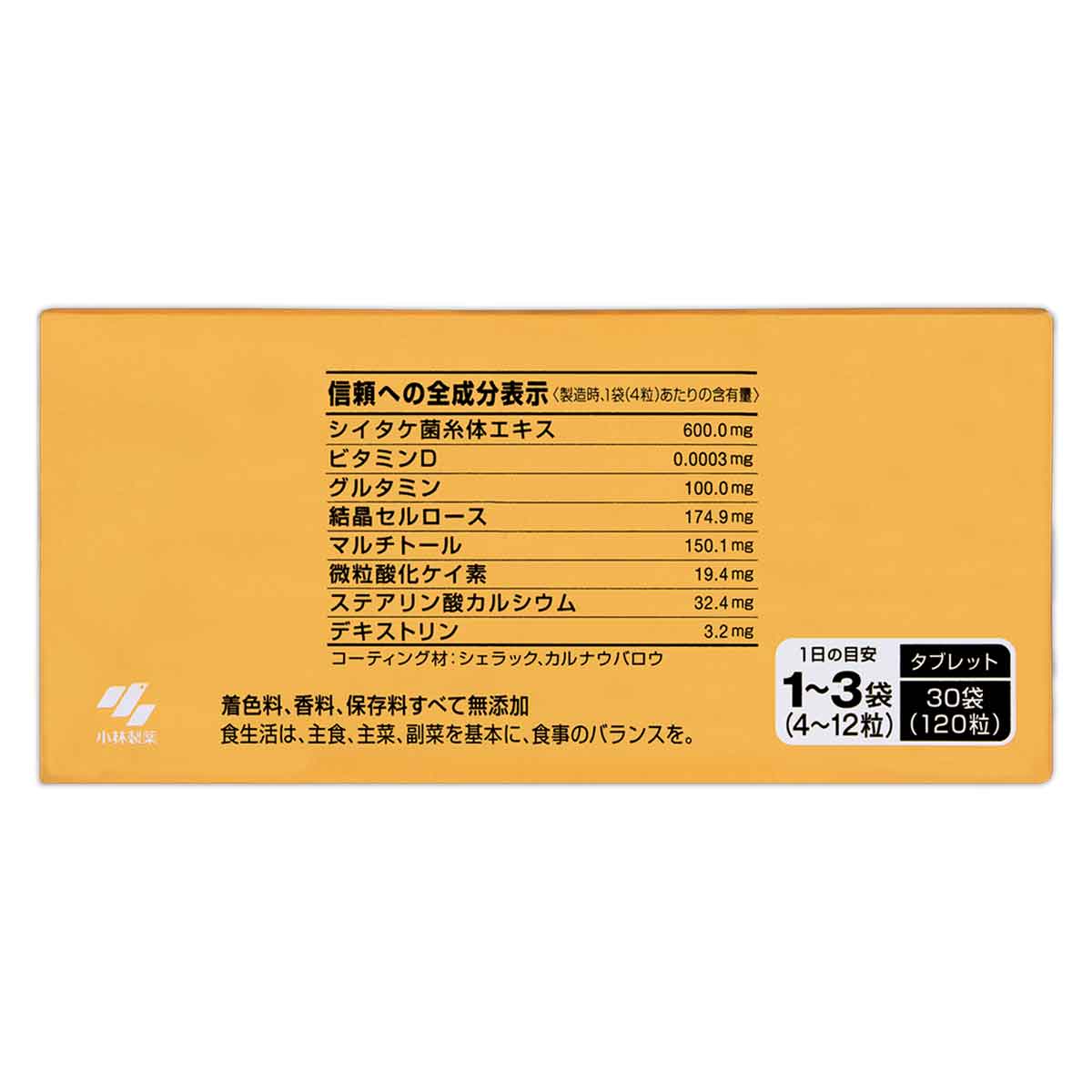 シイタケ菌糸体エキス(国内製造)、マルチトール、デキストリン/結晶セルロース、グルタミン、ステアリン酸カルシウム、微粒酸化ケイ素、シェラック、カルナウバロウ、ビタミンD