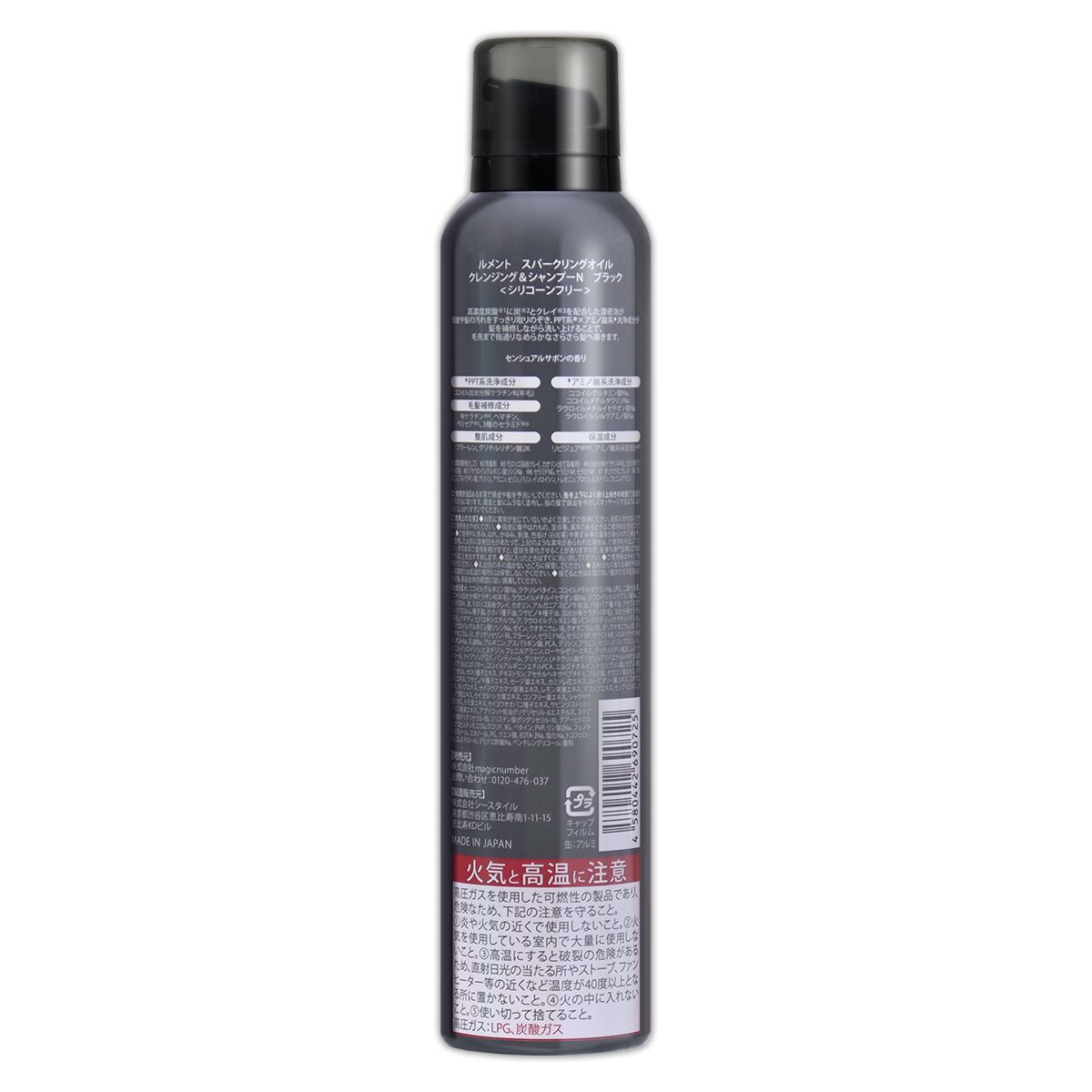 水、ココイルグルタミン酸Na、ラウリルベタイン、ココイルメチルタウリンNa、LPG、二酸化炭素、ココイル加水分解ケラチンK(羊毛)、ラウロイルメチルイセチオン酸Na、ラウロイルシルクアミノ酸Na、コカミドDEA、炭、モロッコ溶岩クレイ、カオリン、アルガニアスピノサ核油、バオバブ種子油、テオブロマグランジフロルム種子脂、ホホバ種子油、ワサビノキ種子油、加水分解ケラチン(羊毛)、加水分解ケラチン(羽毛)、ヘマチン、ヒドロキシエチルウレア、ラウロイルグルタミン酸ジ(フィトステリル/オクチルドデシル)、ジラウロイルグルタミン酸リシンNa、ゼイン、クオタニウム-18、クオタニウム-33、ポリクオタニウム-10、ポリクオタニウム-51、ポリグリセリン-10、フラーレン、セラミドNG、セラミドNP、セラミドAP、シロキクラゲ多糖体、PCA-Na、乳酸Na、アルギニン、アスパラギン酸、PCA、グリシン、アラニン、セリン、バリン、プロリン、トレオニン、イソロイシン、ヒスチジン、フェニルアラニン、ローヤルゼリーエキス、グリチルリチン酸2K、レスベラトロール、ナイアシンアミド、パンテノール、グリセリン、(メタクリル酸グリセリルアミドエチル/メタクリル酸ステアリル)コポリマー、ココイルアルギニンエチルPCA、エルゴチオネイン、トリ(カプリル酸/カプリン酸)グリセリル、セロリ種子エキス、デキストラン、アセチルヘキサペプチド-1、フルボ酸、オウゴン根エキス、ドクダミエキス、ワサビノキ種子エキス、セージ葉エキス、カミツレ花エキス、ローズマリー葉エキス、スギナエキス、ホップエキス、セイヨウアカマツ球果エキス、レモン果実エキス、マコンブエキス、センブリエキス、カンゾウ根エキス、セイヨウハッカ葉エキス、コンフリー葉エキス、シャクヤク根エキス、モモ葉エキス、セイヨウオオバコ種子エキス、サピンヅストリホリアツス果実エキス、アプリコット核油ポリグリセリル-6エステルズ、ステアリン酸ポリグリセリル-10、ミリスチン酸ポリグリセリル-10、グアーヒドロキシプロピルトリモニウムクロリド、BG、ベタイン、PVP、リン酸2Na、フェノキシエタノール、エタノール、PG、クエン酸、EDTA-2Na、塩化Na、トコフェロール、コレステロール、デヒドロ酢酸Na、ペンチレングリコール、香料