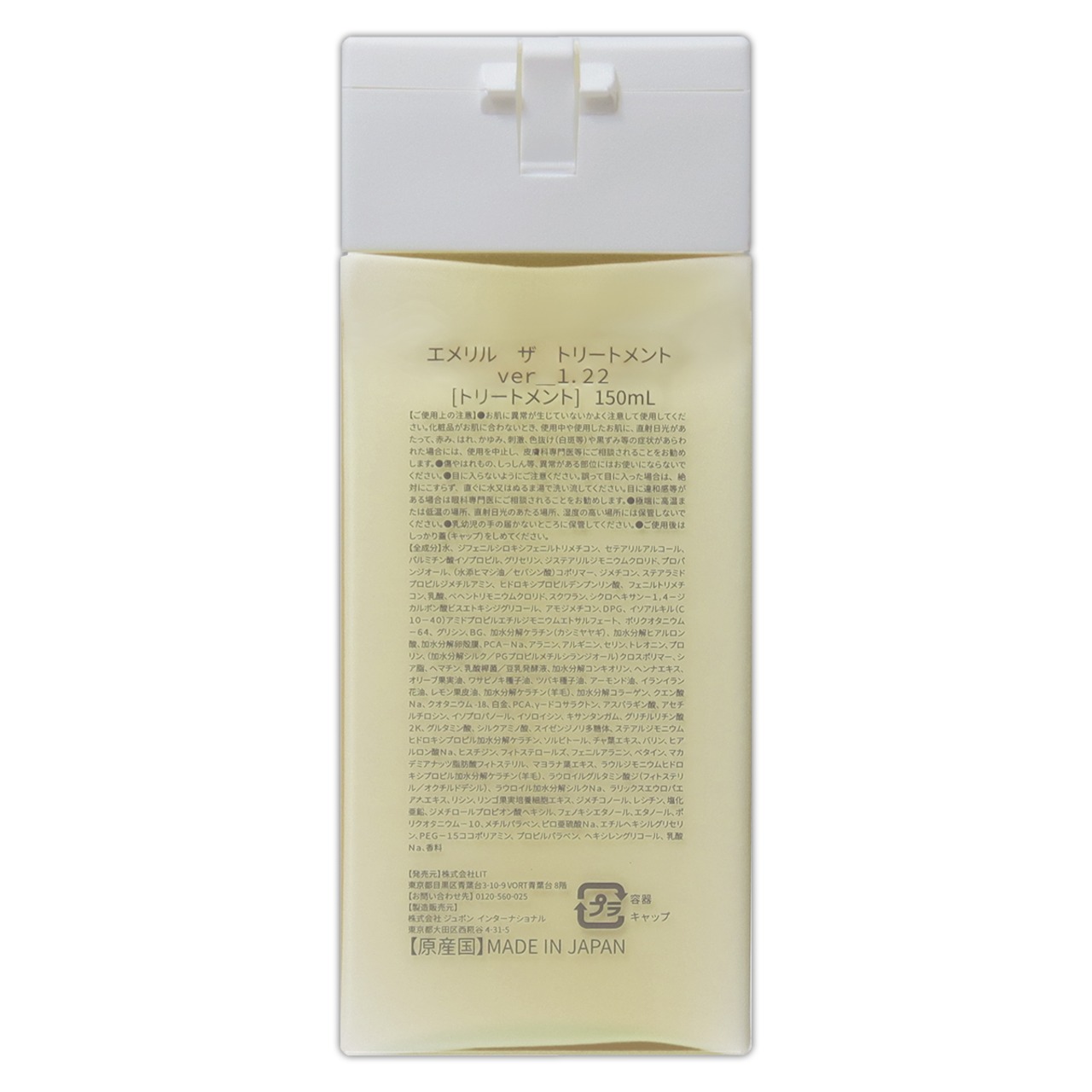 <トリートメント>水、ジフェニルシロキシフェニルトリメチコン、セテアリルアルコール、パルミチン酸イソプロピル、グリセリン、ジステアリルジモニウムクロリド、プロバンジオール、(水添ヒマシ油/セバシン酸)コポリマー、ジメチコン、ステアラミドプロピルジメチルアミン、ヒドロキシプロピルデンプンリン酸、フェニルトリメチコン、乳酸、ベヘントリモニウムクロリド、スクワラン、シクロヘキサン-1,4-ジカルボン酸ビスエトキシジグリコール、アモジメチコン、DPG、イソアルキル(C10-40)アミドプロピルエチルジモニウムエトサルフェート、ポリクオタニウム-64、グリシン、BG、加水分解ケラチン(カシミヤヤギ)、加水分解ヒアルロン酸、加水分解卵殻膜、PCA-Na、アラニン、アルギニン、セリン、トレオニン、プロリン、(加水分解シルク/PGプロピルメチルシランジオール)クロスポリマー、シア脂、ヘマチン、乳酸桿菌/豆乳発酵液、加水分解コンキオリン、ヘンナエキス、オリーブ果実油、ワサビノキ種子油、ツバキ種子油、アーモンド油、イランイラン花油、レモン果皮油、加水分解ケラチン(羊毛)、加水分解コラーゲン、クエン酸Na、クオタニウム-18、白金、PCA、ソードコサラクトン、アスパラギン酸、アセチルチロシン、イソプロパノール、イソロイシン、キサンタンガム、グリチルリチン酸2K、グルタミン酸、シルクアミノ酸、スイゼンジノリ多糖体、ステアルジモニウムヒドロキシプロピル加水分解ケラチン、ソルビトール、チャ葉エキス、バリン、ヒアルロン酸Na、ヒスチジン、フィトステロールズ、フェニルアラニン、ベタイン、マカデミアナッツ脂肪酸フィトステリル、マヨラナ葉エキス、ラウルジモニウムヒドロキシプロピル加水分解ケラチン(羊毛)、ラウロイルグルタミン酸ジ(フィトステリル/オクチルドデシル)、ラウロイル加水分解シルクNa、ラリックスエウロパエアナエキス、リシン、リンゴ果実培養細胞エキス、ジメチコノール、レシチン、塩化亜鉛、ジメチロールプロピオン酸ヘキシル、フェノキシエタノール、エタノール、ポリクオタニウム-10、メチルパラベン、ピロ亜硫酸Na、エチルヘキシルグリセリン、PEG-15ココポリアミン、プロピルパラベン、ヘキシレングリコール、乳酸Na、香料